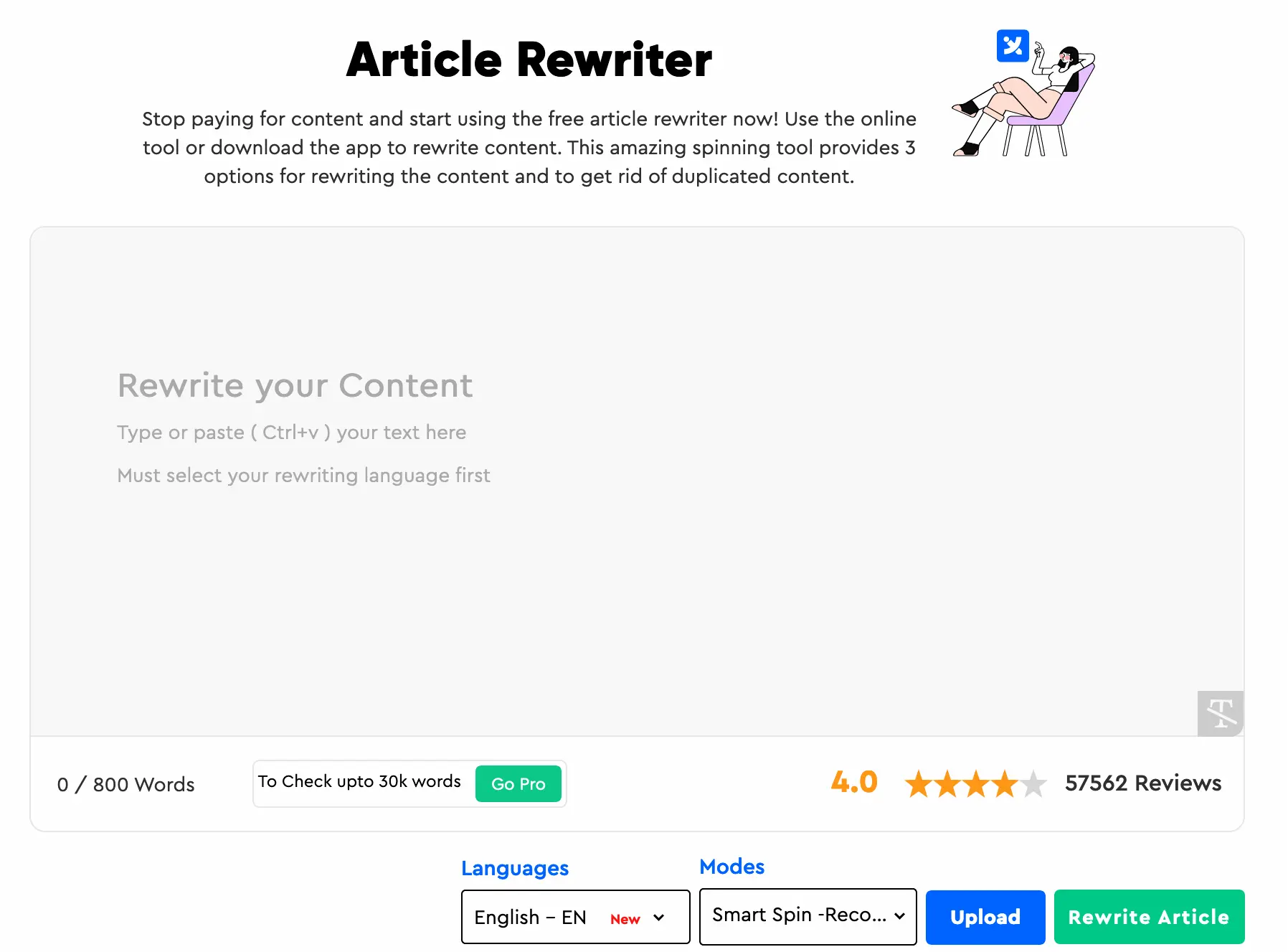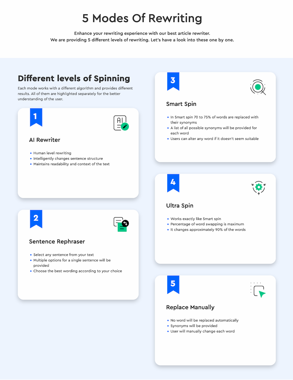 You can choose your desired mode from the available options when using this article spinner. This tool goes beyond the ordinary spinning of words with its smart and advanced modes. These modes include AI rewriter, smart spin, ultra spin, and replace manually.